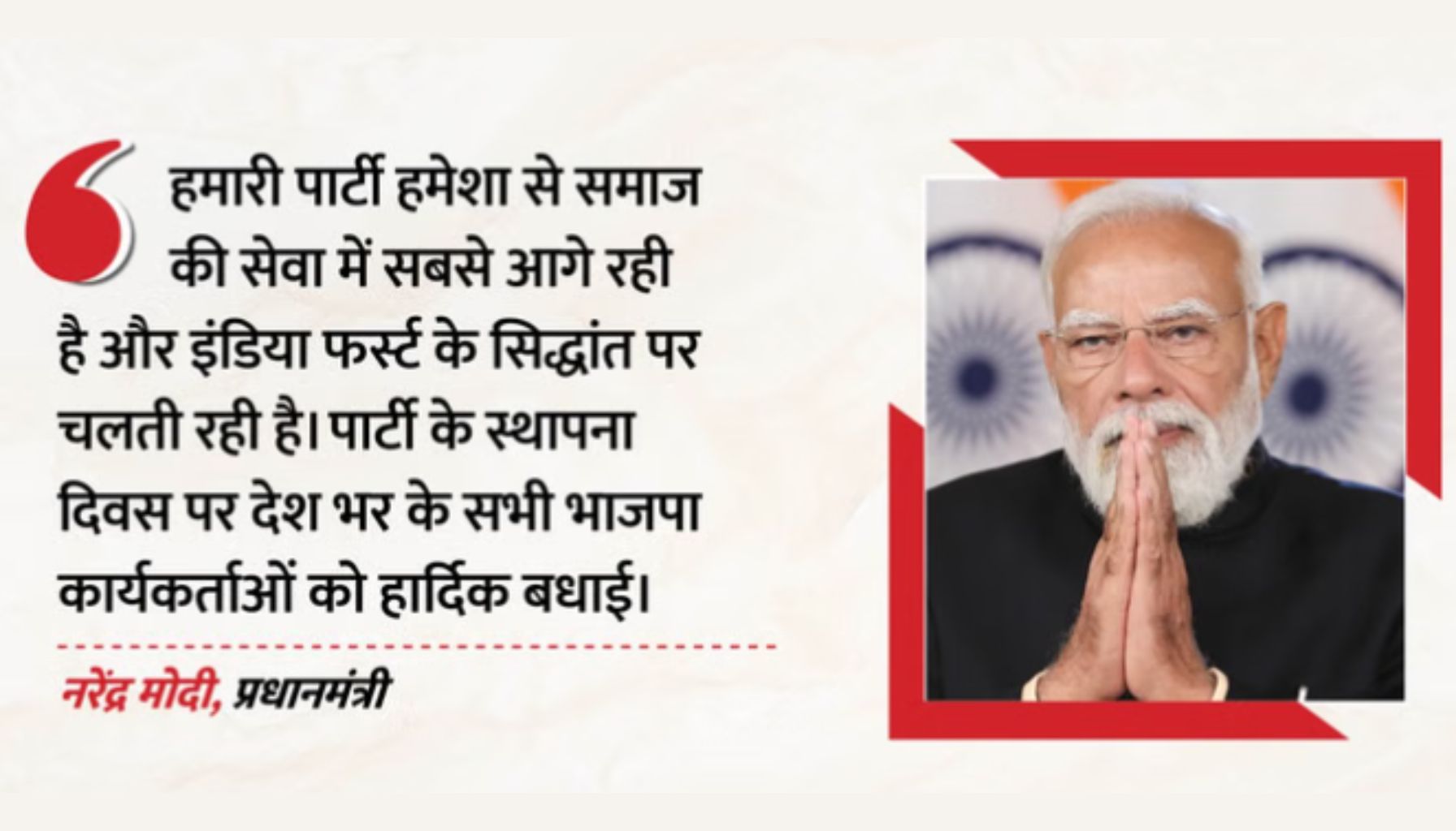 प्रधानमंत्री नरेंद्र मोदी ने अपने संदेश में पार्टी की विचारधारा और कार्यकर्ताओं की भूमिका को विशेष रूप से रेखांकित किया। उन्होंने कहा कि BJP हमेशा ‘इंडिया फर्स्ट’ के सिद्धांत पर चलती रही है और समाज सेवा को सर्वोच्च प्राथमिकता देती है। मोदी ने कहा कि पार्टी की ताकत उसके करोड़ों कार्यकर्ता हैं, जो निस्वार्थ भाव से राष्ट्र निर्माण में जुटे हुए हैं।